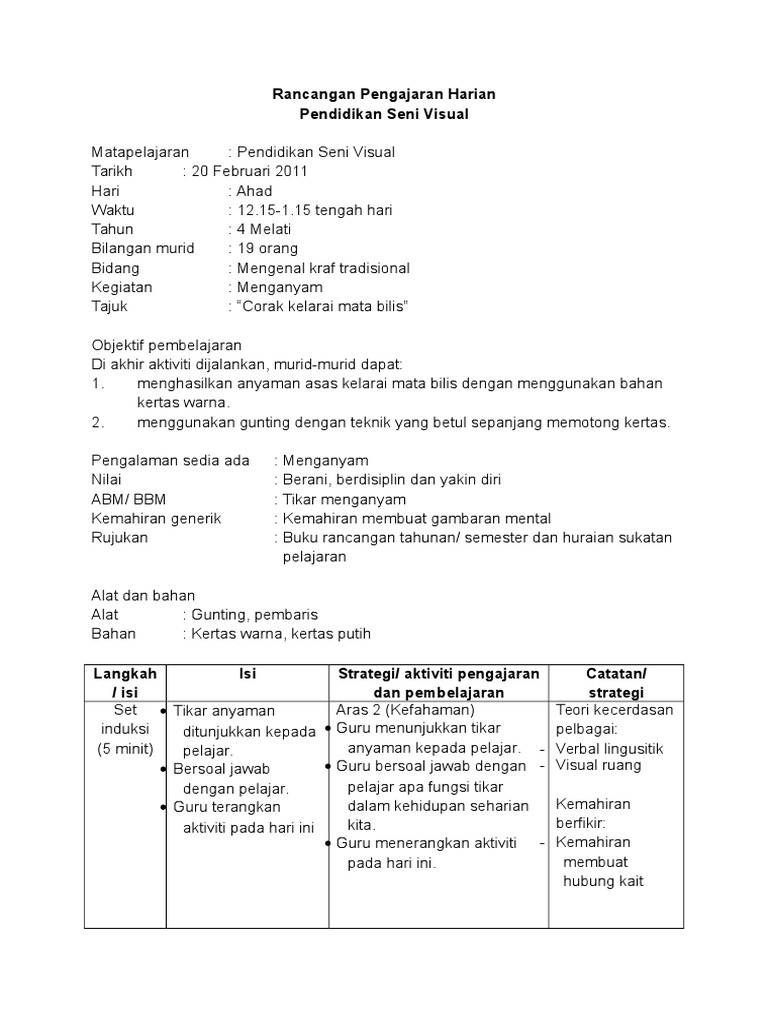 Doc Rancangan Pengajaran Harian Pendidikan Seni Visual Bil Perkara Dyana Nonong Academia Edu