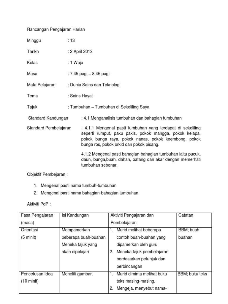 Rancangan Pengajaran Harian Tahun Satu Tumbuhan