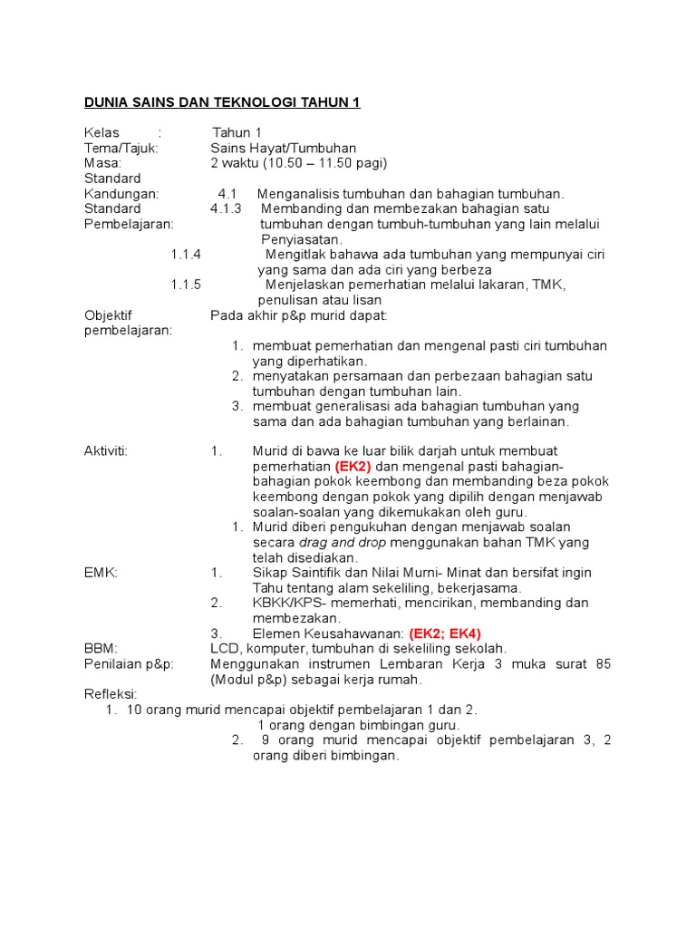 Contoh Rph Sains Tahun 1 Kssr Semakan 2017