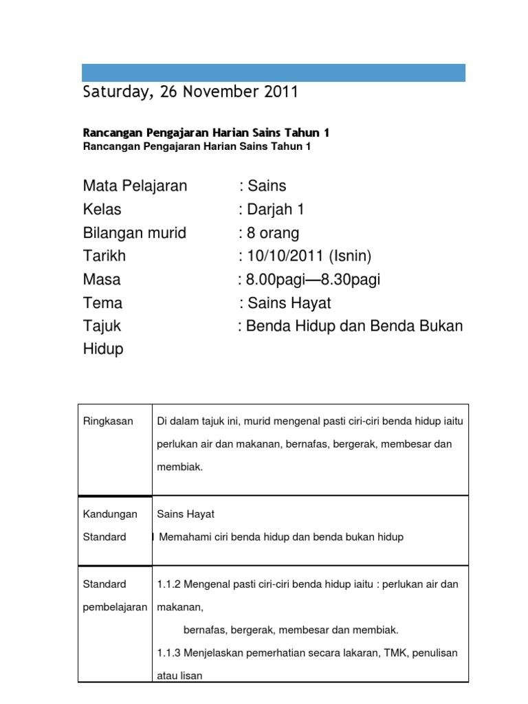 Rancangan Pengajaran Harian Contoh Sains Tahun 2 Tarikh 20 10 2011 Sains Tarikh Orang