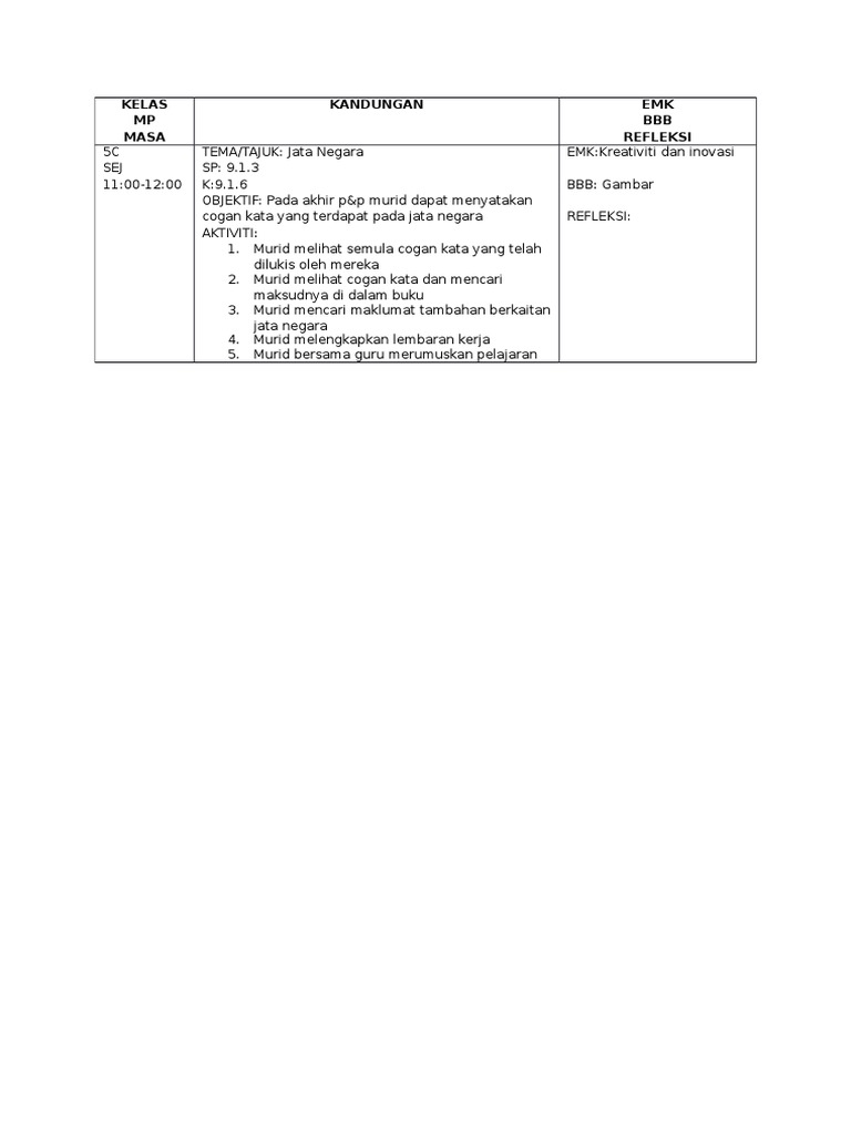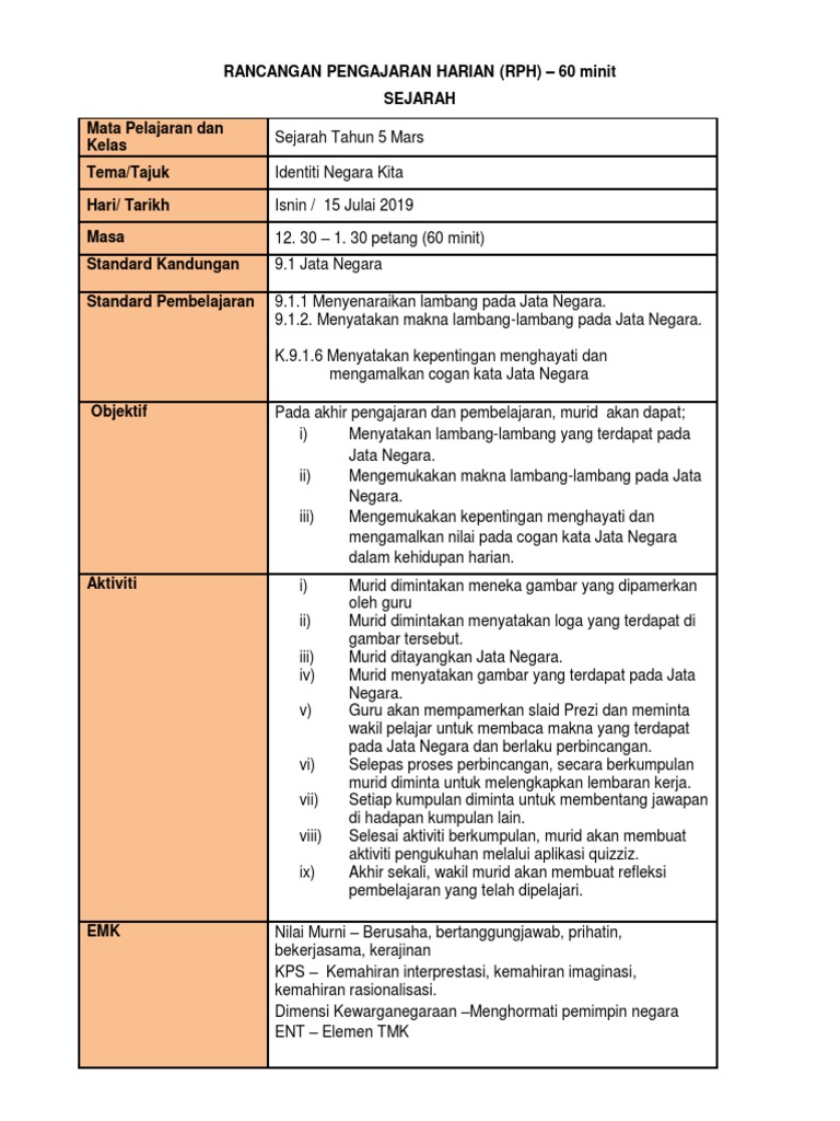 Rancangan Pengajaran Harian Rph 60 Minit Sejarah Mata Pelajaran Dan Kelas Tema Tajuk Hari Tarikh Masa Standard Kandungan Standard Pembelajaran