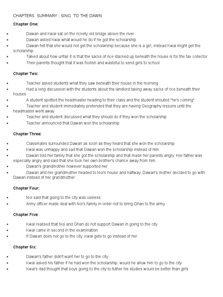 Chapters Summary Sing To The Dawn
