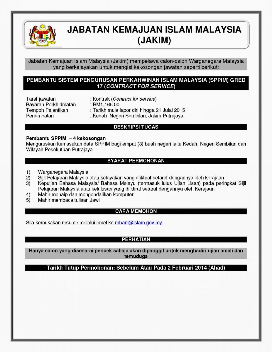 Jobs Malaysia Jawatan Pembantu Sistem Pengurusan Perkahwinan Islam Malaysia Sppim Gred 17 Contract For Service