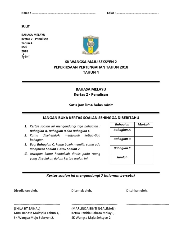 Sk Wangsa Maju Seksyen 2 Peperiksaan Pertengahan Tahun 2018 Tahun 4