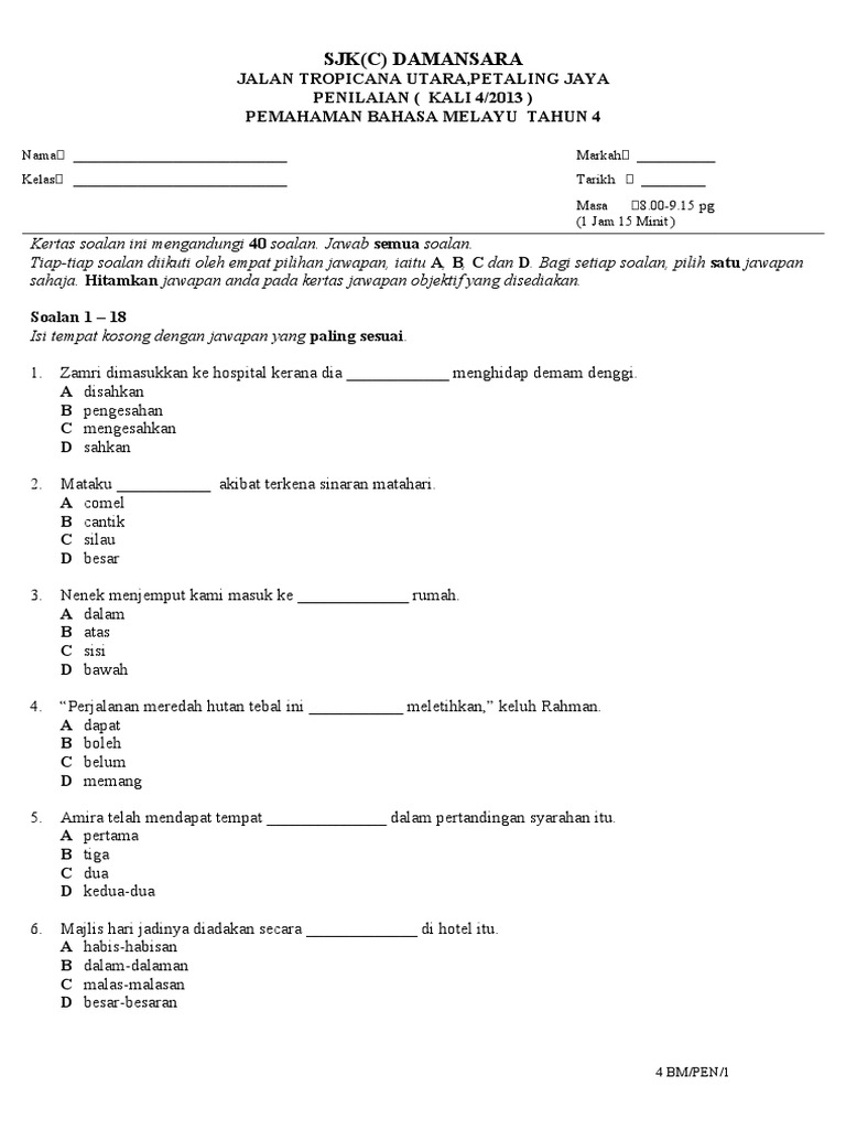 Bank soalan bahasa malaysia tahun 1. Ujian bulan mac bahasa melayu tahun 4 2018 adalah sebahagian kertas soalan yang telah berjaya dikumpulkan dan dikemaskini oleh gurubesar my. 1 sjk c kota emerald 48000 rawang selangor pksr 2 bahasa malaysia pemahaman tahun 4 50 minit nama. Program motivasi kecemerlangan murid tahun empat sjk c pei hwa diadakan pada 1 markah b.
